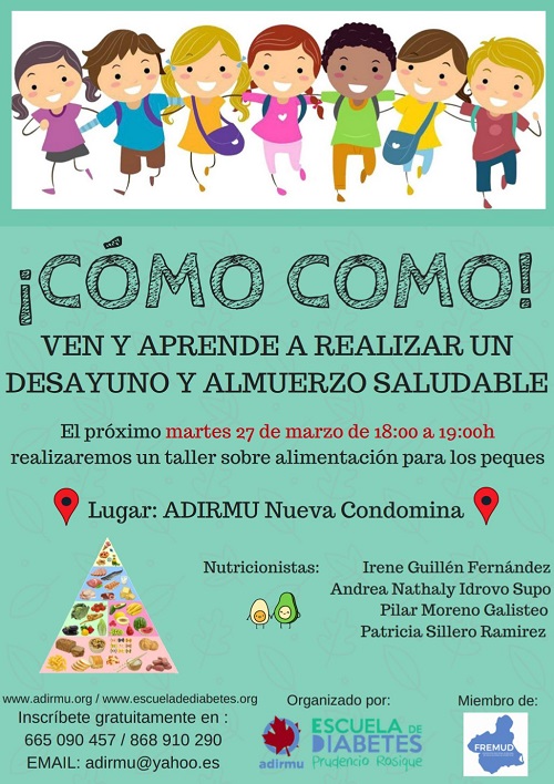 El próximo martes 27 de marzo de 18:00 a 19:00 la asociación de diabetes ADIRMU realizará un taller de alimentación para los más pequeños.