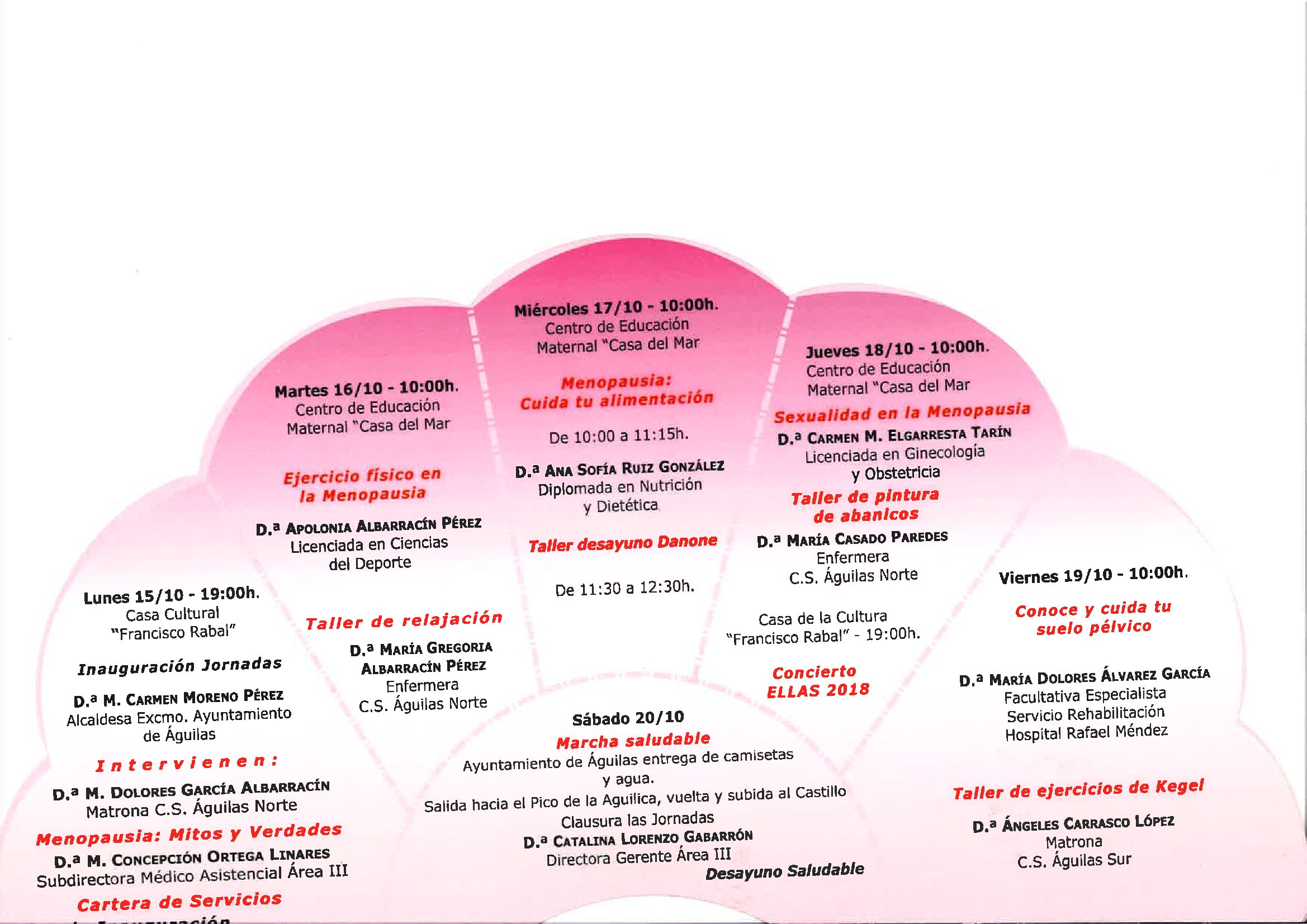 Desde el 15/10/2018 al 20/10/2018. Se realizarán una seri de actividades en la Casa cultural Francisco Rabal, en el Centro educación maternal Casa del Mar y en la plaza del ayuntamiento de Águilas relacionadas con la I Jornada de Menopausia.