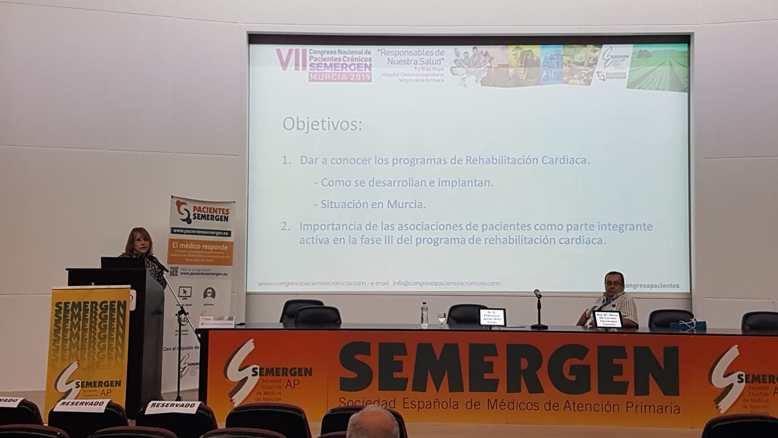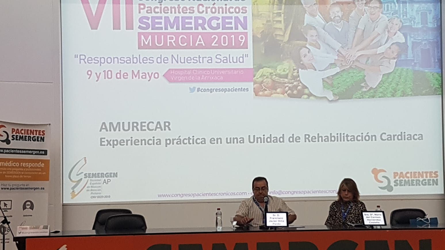 Intervino Carmen Hernández Castello, Enfermera, Cofundadora y Secretaria de la Delegación en Murcia de la Asociación Española de Enfermería en Cardiología y miembro del grupo de enfermedades del corazón de la Escuela de Salud de Murcia y Francisco Javier Ortíz Pardo, Presidente de AMURECAR y paciente de la Unidad de Rehabilitación.