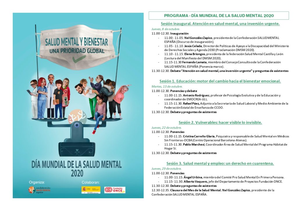 La Confederación Salud Mental España ha organizado para el mes de octubre varios webinar gratuito con motivo del Día Mundial de la Salud Mental.